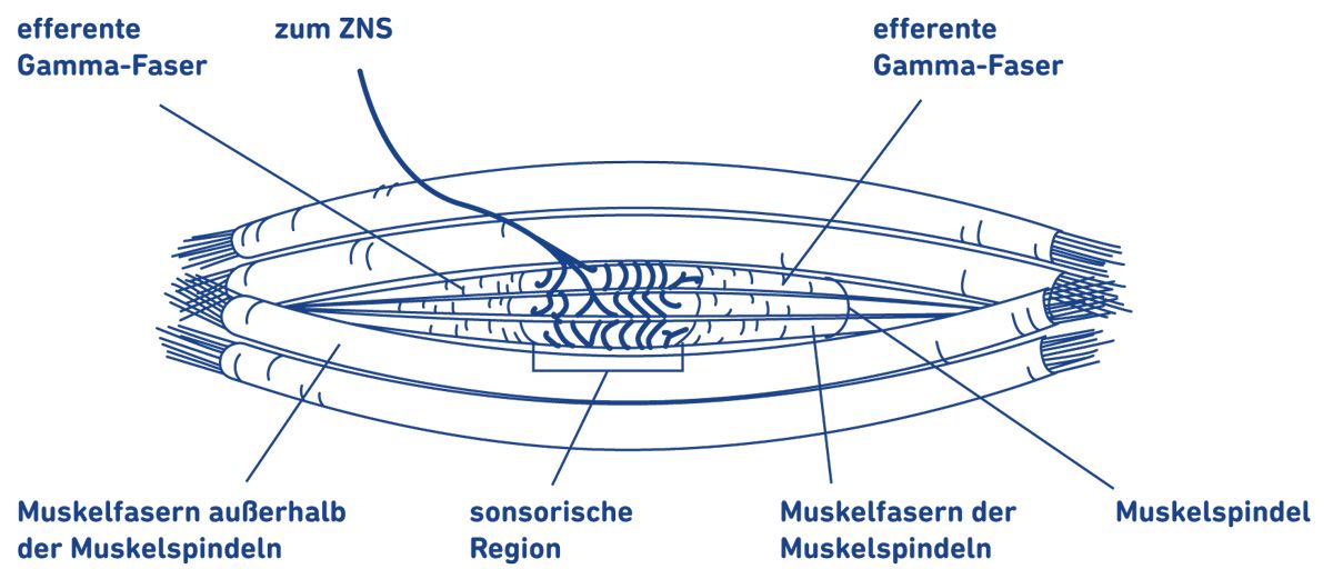 Muskelspindeln sind Dehnungsrezeptoren. Die Dehnung eines Muskels bewirkt zugleich eine Dehnung der Muskelspindeln. Die Muskelspindeln sind mit afferenten Nervenendigungen, den Ia-Fasern, ringförmig umwickelt (Abb. 1). Über die dicken, markhaltigen Ia-Fasern wird die Erregung mit hoher Geschwindigkeit (70-120 m/s) in das