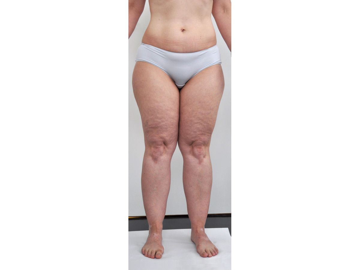 Im Krankheitsverlauf kommt es zu einem verstärkten Schmerz und Fettzunahme, danach kann es vermehrt zu Folgeerscheinungen des Lipödems kommen. Die Progredienz ist sehr verschieden, nicht immer vorhanden und korreliert oft mit allgemeiner Gewichtzunahme, bei einer hohen Koinzidenz mit Adipositas. Die Volumenzunahme infolge Vermehrung subkutanen Fettgewebes an den Extremitäten [Abb. 2] kann diskret sein, aber auch bis zu überhängendem Gewebe (Wammen) an Knien, supramalleolär und über den Ellenbogen reichen. Als Folgen können mechanische Irritationen und Hautmazerationen entstehen. Wammen an den Oberschenkelinnenseiten und Kniegelenken resultieren darüber hinaus in Störungen des Gangbildes mit sekundären Arthrosen [15].