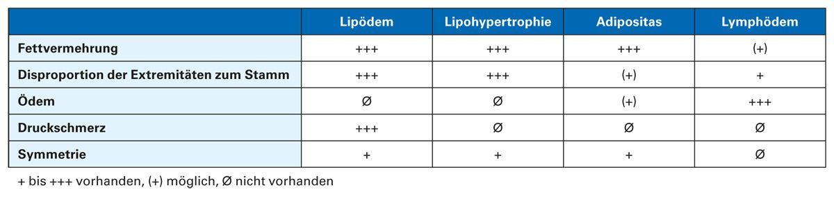 Die wichtigsten Differenzialdiagnosen sind die zentrale Adipositas und das Lymphödem [18] (Tab. 1). Beide Erkrankungen können bei Patientinnen mit einem Lipödem auftreten und sind nach bisherigen Erkenntnissen nicht Folge des Lipödems. Das Lipödem an sich verursacht kein Lymphödem, eine begleitende Adipositas kann jedoch zur Bildung eines Lymphödems führen. Das Vorliegen der Leitsymptome Schmerzen und Spannungsgefühl deuten auch bei bestehender Adipositas auf ein Lipödem hin. Häufig assoziierte psychische Begleiterkrankungen sollten routinemäßig erfragt werden, um gegebenenfalls frühzeitig eine notwendige Therapie zu beginnen.