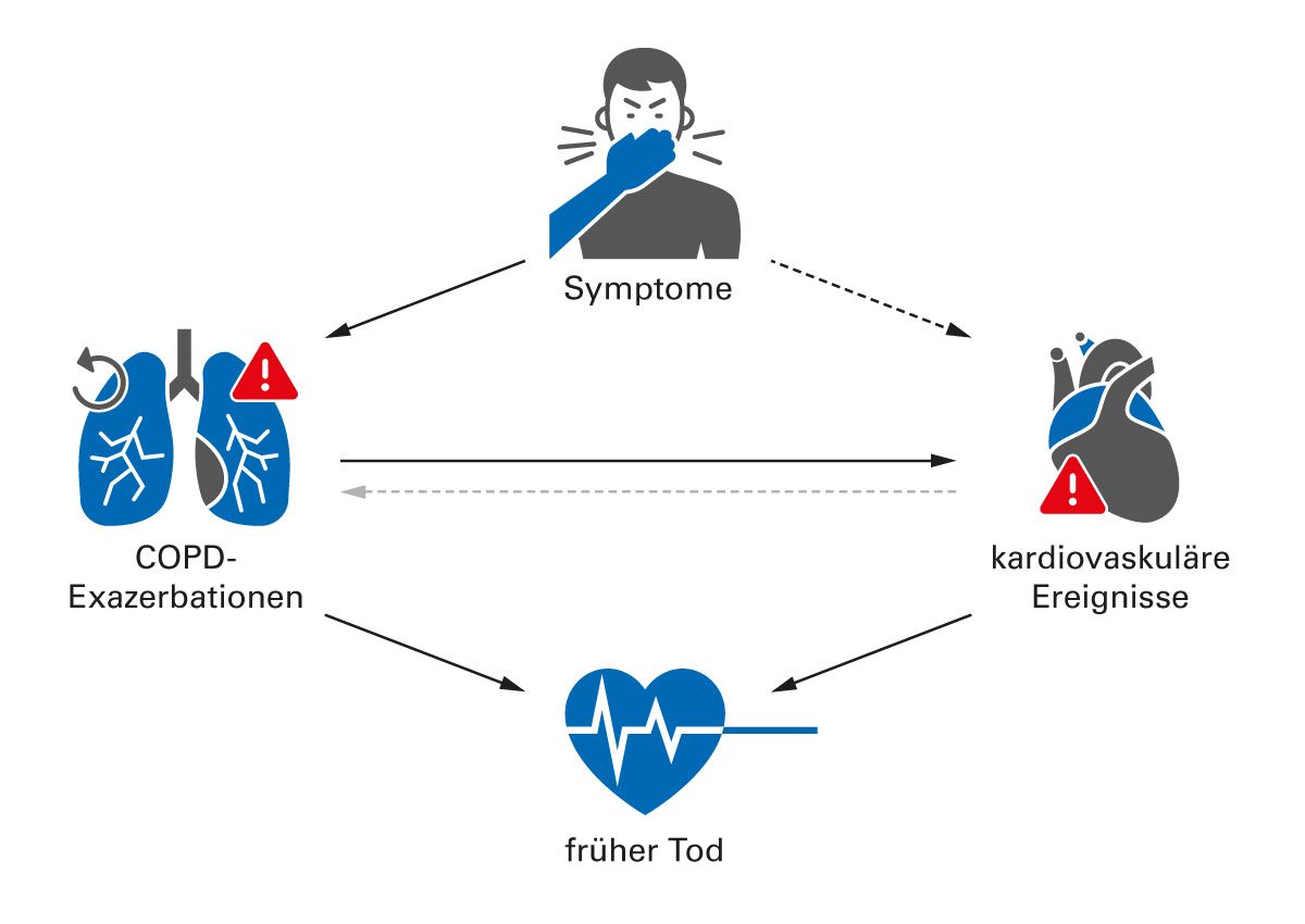 Das Gesamtmortalitätsrisiko bei der chronisch obstruktiven Lungenerkrankung (COPD) ist im Vergleich zu Patient:innen ohne COPD deutlich erhöht [1]. Kardiovaskuläre (CV) Erkrankungen tragen dabei zur hohen Mortalität bei COPD-Patient:innen bei [2]. Die Pathophysiologie, die hinter der Verbindung zwischen COPD und kardiovaskulären Erkrankungen steht, ist komplex und multifaktoriell. Ein höheres Lebensalter, Entzündungsprozesse, Hypoxie, Hyperinflation und eine reduzierte körperliche Aktivität sind nur einige der Faktoren, die zur Entwicklung von Herz-Kreislauf-Erkrankungen bei diesen Patient:innen beitragen können [3]. Ein wesentlicher Treiber dieser Ereignisse sind COPD-Exazerbationen [2].