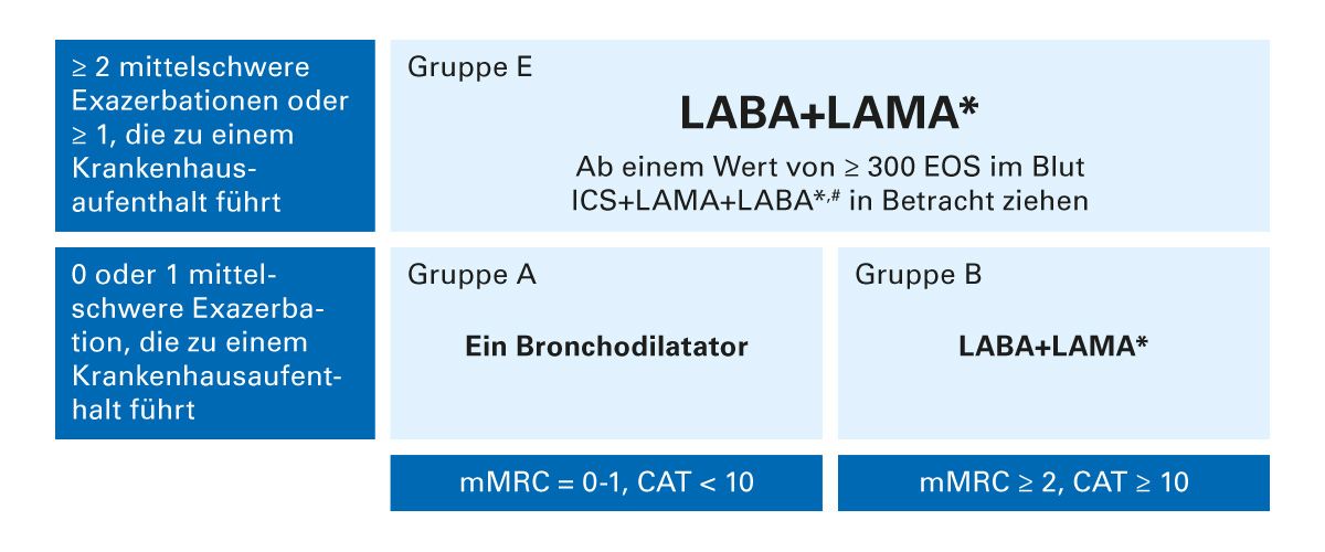 Laut der aktuellen GOLD-Empfehlung sollen zur Erstbehandlung der COPD lang wirksame Beta-2-Rezeptoragonisten (LABA) und/oder lang wirksame Muskarin-Rezeptorantagonisten (LAMA) eingesetzt werden (Abb. 4). Ab einem Wert von über 300 Eosinophilen/&mikro;l im Blut kann laut GOLD-Report bei therapienaiven COPD-Patient:innen der Gruppe E eine Triple-Therapie (inhalatives Corticosteroid (ICS)/LAMA/LABA) in Betracht gezogen werden, was jedoch außerhalb der Zulassung liegt.