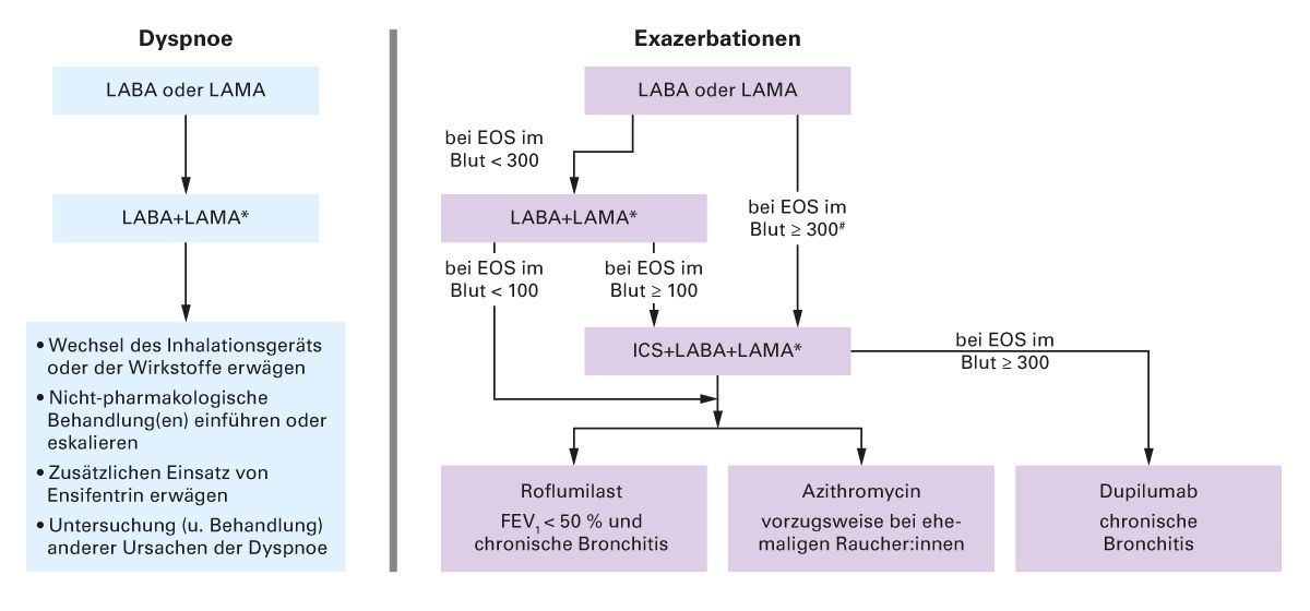 EOS = Anzahl der Eosinophile pro μl Blut; FEV1 = Einsekundenkapazität; ICS = inhalative Corticosteroide; LABA = langwirksame Beta2-Rezeptoragonisten; LAMA = langwirksame Muskarin- Rezeptorantagonisten. §Erwägung einer Deeskalation der ICS bei Lungenentzündung oder anderen erheblichen Nebenwirkungen. Bei einem EOS-Wert von ≥ 300 Zellen/µl ist eine Deeskalation der Therapie eher mit der Entwicklung von Exazerbationen verbunden. Exazerbationen bezieht sich auf die Anzahl der Exazerbationen pro Jahr. *Die Therapie mit einem Inhalator kann vorteilhafter und effektiver sein als eine Therapie mit mehreren Inhalatoren. Einzelne Inhalatoren können die Adhärenz verbessern. #Fixdosis-Triple-Therapien sind nur für Patient:innen mit einer vorbestehenden dualen inhalativen Therapie zugelassen.