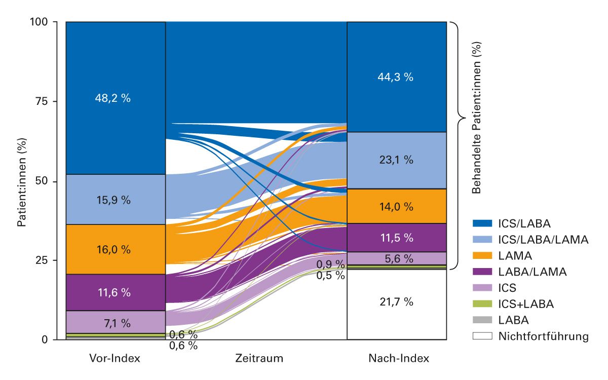 Die Studie AvoidEx unterstreicht, dass die Versorgungsrealität bei COPD in Deutschland aktuell häufig kritisch ist. 43 % aller Patient:innen erhielten in den letzten 12 Monaten vor dem Tod keine dauerhafte COPD-Medikation. Obwohl die Patient:innen einem Hochrisikokollektiv zuzurechnen waren, erfolgte der Studie zufolge kaum eine Therapieanpassung [1]. Auch aus der DACCORD-Studie lässt sich ableiten, dass nur bei wenigen Patient:innen eine Anpassung der Therapie stattfindet [52]. Internationale Studien betonen ebenfalls die unzureichende Versorgung von COPD-Patient:innen. Eine Auswertung von Krankenkassendaten aus den USA zeigte, dass der Anteil an Patient:innen mit COPD-Medikation nach einer Exazerbation sogar abnahm (Abb. 6) [53].