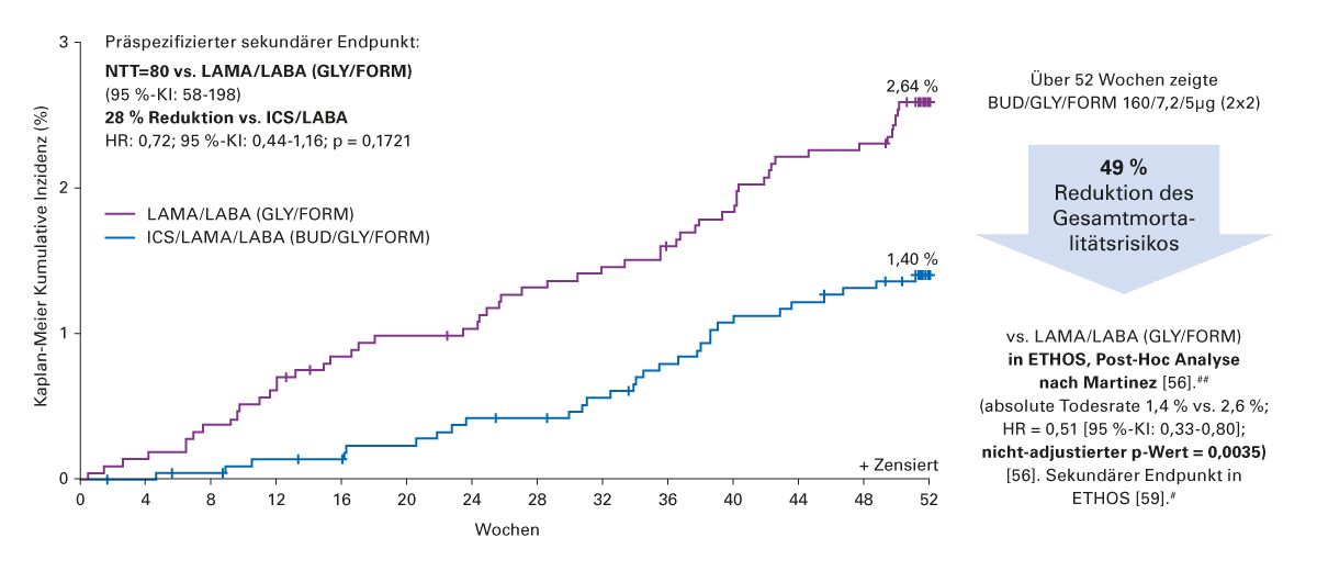 Eine Post-hoc-Analyse der ETHOS-Studie# konnte eine Reduktion der Gesamtmortalität um 49 % von BUD/GLY/FORM gegenüber GLY/FORM (LAMA/LABA) über 52 Wochen belegen [56]. Das Gesamtmortalitätsrisiko im BUD/GLY/FORM (160/7,2/5 μg, 2×2)-Arm war niedriger vs. GLY/FORM (LAMA/LABA) (sekundärer Endpunkt, absolute Todesrate 1,4 % vs. 2,6 %; Hazard Ratio [HR]: 0,51 [95 %-KI: 0,33–0,80]; nicht adjustierter p-Wert = 0,0035) (Abb. 7) [56]. #,## In der Studie wurden dabei nicht nur die pulmonalen Todesfälle verringert, sondern auch die kardiovaskuläre Mortalität [56].