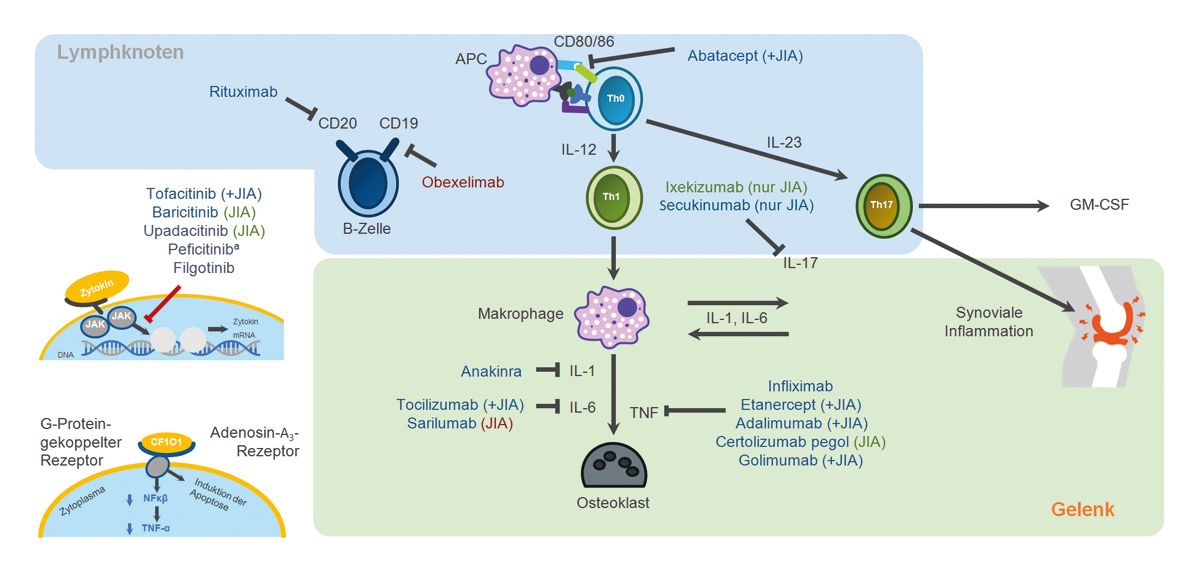 Abb. 1: Wirkmechanismus verschiedener Biologika am Beispiel Rheumatoide Arthritis und juvenile idiopathische Arthritis (JIA). Adalimumab, Golimumab, Infliximab, Certolizumab pegol und Etanercept blockieren den zentralen Entzündungsfaktor TNF. Anakinra blockiert Interleukin-1, Tocilizumab und Sarilumab hemmen IL-6. Rituximab indiziert eine B-Zell-Depletion durch Bindung an das Oberflächenmolekül CD20. Ixekizumab und Secukinumab blockieren IL-17. Auch Abatacept blockiert T-Lymphozyten. Blau=zugelassen in der EU und/oder den USA; grün=Phase III; rot=Phase II; ain Japan zugelassen (Stand Januar 2024). Modifiziert nach Her M, Kavanaugh A (2015), Kofoed K et al. (2015) und Murray GM, et al. (2021)