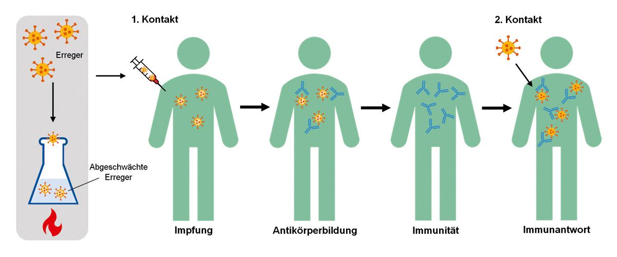 Bei einem klassischen Impfstoff handelt es sich um ein biologisch oder gentechnisch hergestelltes Antigen. Eine Ausnahme stellen die Vektorimpfstoffe und die neuen mRNA-Vakzine dar, bei denen das Antigen von körpereigenen Zellen hergestellt wird. Bis 2020 in Deutschland zugelassene Impfstoffe bestehen meistens aus Protein-Bruchstücken abgetöteter bzw. attenuierter Erreger. Der Impfstoff nutzt die natürliche Reaktion des Immunsystems, auf Erreger eine humorale (erreger-spezifische Antikörper) sowie zelluläre (T-Zellen) Immunantwort zu induzieren. Bei der Immunisierung kommt es zum langfristigen Schutz, indem der Körper Antikörper und Gedächtniszellen bildet. Bei erneutem Kontakt mit echten Erregern leiten noch vorhandene Antikörper und Gedächtniszellen eine rasche Immunantwort ein, die dann eine Erkrankung abwehren soll (Abb. 2).