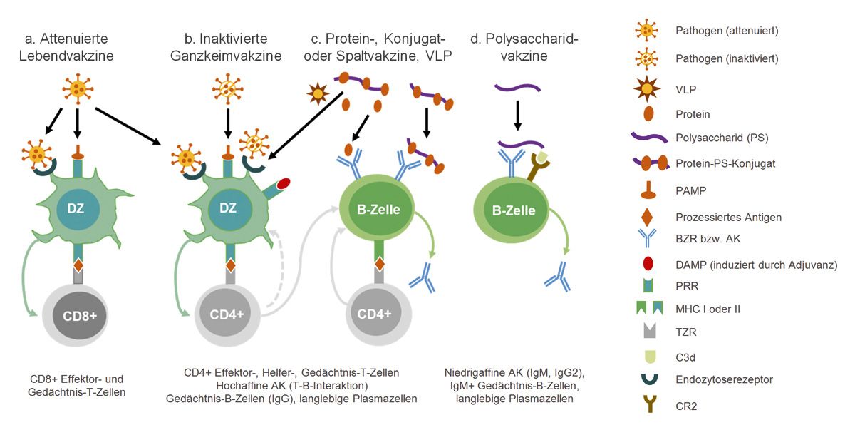 Abb. 3: (a) Impfstoffe aus lebenden attenuierten, (b) abgetöteten intakten Erregern und (c) virusähnlichen Partikeln (VLP) oder Spaltimpfstoffe werden von dendritischen Zellen (DZ) über Endozytose-Rezeptoren aufgenommen und degradiert. Die daraus resultierenden Peptide werden über Klasse I bzw. Klasse II Gewebeverträglichkeitsmoleküle (MHC) an die T-Zellrezeptoren (TZR) naiver Cluster of Differentiation (CD)8+ bzw. CD4+ T-Lymphozyten präsentiert, die sich daraufhin in Effektor-, Helfer- und Gedächtnis-T-Zellen differenzieren. Bestimmte Erregerkomponenten (sog. pathogen-associated molecular patterns, PAMPs) binden an die entsprechenden Rezeptoren auf den DZ und verstärken durch die Induktion von Zytokinen und kostimulatorischen Molekülen deren T-Zell-stimulatorische Aktivität (blaue Pfeile). Einen ähnlichen Effekt üben Adjuvantien aus, welche u. a. die Freisetzung von endogenen, immunstimulativen Gefahrenmolekülen (sog. danger-associated molecular patterns, DAMPs) auslösen. Die protektive Funktion von Vakzin-induzierten CD8+ Effektor- bzw. Gedächtniszellen besteht in der Zytotoxizität gegenüber Wirtszellen nach Infektion mit virulenten Wildtyp-Erregern. Vakzin-induzierte CD4+ T-Lymphozyten hingegen vermitteln primär Schutz durch Aktivierung von DZ (gestrichelter grauer Pfeil) und Makrophagen zur antimikrobiellen Aktivität sowie durch Stimulierung von B-Lymphozyten zur Umwandlung in Antikörper (AK)-produzierende Plasmazellen und Gedächtnis-B-Zellen (durchgezogener grauer Pfeil). (c) Bei Protein-Vakzinen kommt es zur Antigenaufnahme durch DZ (via Endozytose-Rezeptoren) oder B-Lymphozyten (via B-Zellrezeptor [BZR]) und nachfolgenden Antigenpräsentation an CD4+ T-Lymphozyten, die dann wiederum als Helferzellen die AK-Produktion von B-Zellen unterstützen. Bei Konjugat-Vakzinen (bestehend aus dem Polysaccharid [PS] und einem immunogenen Protein) wird die Anti-PS-Immunantwort der B-Zellen durch die parallele („bystander“) Zytokinfreisetzung peptidreaktiver T-Lymphozyten (welche durch proteinprozessierende und peptidpräsentierende DZ oder B-Zellen aktiviert wurden) verstärkt (graue durchgezogene Pfeile), sodass PS-reaktive hochaffine Antikörper sowie PS-spezifische klassische Gedächtnis-B-Zellen und langlebige Plasmazellen entstehen. (d) Reine Polysaccharid-Vakzine binden direkt an membranständiges Immunglobulin M (BZR) sowie nach alternativer Komplementaktivierung über C3d an den Typ 2 Komplementrezeptor (CR2) auf der Oberfläche von B-Lymphozyten. Diese T-Zell-unabhängige B-Zellaktivierung führt zur Bildung von langlebigen Plasmazellen und Immunglobulin M+ Gedächtnis-B-Zellen, die niedrigaffine Immunglobulin M und Immunglobulin G2 Antikörper synthetisieren. [Modifiziert nach Niehues 2017]