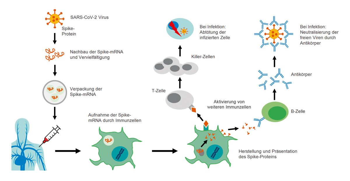 mRNA-Impfstoffe stimulieren die körpereigene Immunantwort. Die mRNA-basierten Impfstoffe werden rein synthetisch hergestellt und sind nicht infektiös. Sie enthalten selbst keine viralen Proteine, sondern nur die Informationen, die die körpereigenen Zellen benötigen, um ein virusspezifisches Protein zu produzieren, das die gewünschte Immunantwort auslöst. Ein mRNA-Impfstoff besteht aus einem mRNA-Strang, der für ein krankheitsspezifisches Protein (Antigen) kodiert. Im Fall der mRNA-Impfstoffe gegen COVID-19 wurde die mRNA des Spike-Proteins verwendet, das sich an der Oberfläche des Coronavirus befindet. Die mRNA ist von einer Lipidhülle umgeben, welche die Aufnahme der mRNA in die Körperzellen verbessert und die Impfstoffstabilität erhöht. Anhand der Informationen aus der mRNA kann der Körper das Antigen, in dem Falle das nicht infektiöse virale Spike-Protein, selbst produzieren. Dies geschieht im Zytoplasma. Antigen-präsentierende Zellen (APZ) im Körper präsentieren dann das Antigen auf ihrer Oberfläche und lösen dadurch die gewünschte spezifische Immunantwort aus. Es kommt zur Aktivierung von T-Zellen, die in der Lage sind, infizierte Zellen zu erkennen und zu eliminieren.