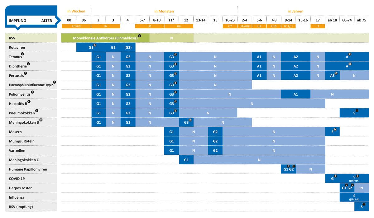 G=Grundimmunisierung (in bis zu 3 Teilimpfungen G1 – G3); S=Standardimpfung; A=Auffrischimpfung; N=Nachholimpfung (Grundimmunisierung aller noch nicht Geimpften bzw. Komplettierung einer unvollständigen Impfserie); U=Früherkennungsuntersuchung; J=Jugenduntersuchung (J1 im Alter von 12–14 Jahren). a RSV (monoklonale Antikörper): Zwischen April und September Geborene sollen Nirsevimab im Herbst vor Beginn ihrer 1. RSV-Saison erhalten; Neugeborene jeglichen Gestationsalters, die während der RSV-Saison (meist zwischen Oktober und März) geboren werden, sollen Nirsevimab möglichst rasch nach der Geburt erhalten, idealerweise bei Entlassung aus der Geburtseinrichtung bzw. bei der U2 (3.-10. Lebenstag). b Rota: Erste Impfstoffdosis bereits ab dem Alter von 6 Wochen, je nach verwendetem Impfstoff 2 bzw. 3 Impfstoffdosen im Abstand von mind. 4 Wochen. c TdaPHibIPV/HepB/Pnc: Frühgeborene: zusätzliche Impfstoffdosis im Alter von 3 Monaten, d. h. insgesamt 4 Impfstoffdosen. d TdaPHibIPV/HepB/Pnc: Mindestabstand zur vorangegangenen Dosis: 6 Monate. e MenB: 3 Dosen im Alter von 2 bis 23 Monaten, ab 24 Monaten besteht die Impfserie aus 2 Dosen. f HPV: Zwei Impfstoffdosen im Abstand von mind. 5 Monaten, bei Nachholimpfung beginnend im Alter ≥ 15 Jahren oder bei Impfabstand von < 5 Monaten zwischen 1. und 2. Dosis ist eine 3. Dosis erforderlich. g Td(ap): Td-Auffrischimpfung alle 10 Jahre. Nächste fällige Td-Impfung 1-malig als Tdap- bzw. bei entsprechender Indikation als Tdap-IPV-Kombinationsimpfung. h MMR: Eine Impfstoffdosis eines MMR-Impfstoffs für alle nach 1970 geborenen Personen ≥ 18 Jahre mit unklarem Impfstatus, ohne Impfung oder mit nur einer Impfung in der Kindheit. i Pnc: Impfung mit PCV20. j COVID19: Für den Schutz von Personen ohne Grunderkrankung sind (mindestens) 3 Antigen-Kontakte nötig, davon mindestens 1 als Impfung. k H. zoster: Zwei Impfstoffdosen des adjuvantierten Herpes-zoster-Totimpfstoff im Abstand von mindestens 2 bis maximal 6 Monaten. l RSV (Impfung): 1-malige Impfung mit einem proteinbasierten RSV-Impfstoff im Spätsommer/Herbst vor Beginn der RSV-Saison. * Impfungen können auf mehrere Impftermine verteilt werden. MMR und V können am selben Termin oder in 4-wöchigem Abstand gegeben werden.