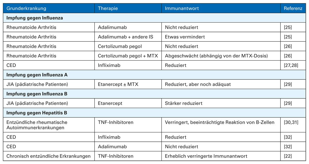 Die Tabelle basiert auf einer Literaturrecherche und erhebt keinen Anspruch auf Vollständigkeit. Die Aussagekraft der Auswirkungen der jeweiligen TNF-Inhibitoren auf die Immunantwort ist limitiert, da keine Fallkontrollstudien durchgeführt wurden. Weitere Limitationen sind geringe Fallzahlen, Vergleiche mit und ohne MTX sowie Reduktion der Immunantwort durch Faktoren wie Alter und Komorbiditäten.