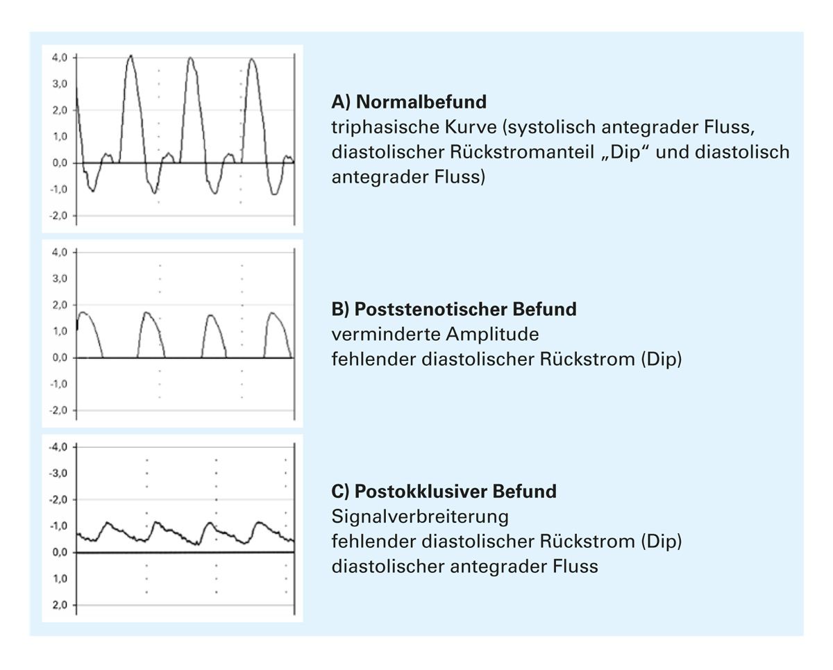 Die farbkodierte Duplexsonografie ist der Goldstandard in der nicht-invasiven Gefäßdiagnostik beider Systeme. Venensonografie (Kompressionsultraschall, DopplerFlusskurven) erlaubt den Nachweis von Venenklappeninsuffizienzen (Reflux in V. saphena magna/parva bei Varikose, Insuffizienz der tiefen Venen bei postthrombotischem Syndrom) sowie von venösen Thrombosen. Arterielle Duplexsonografie detektiert Stenosen/Verschlüsse in den Extremitätenarterien und bewertet hämodynamisch (Strömungsgeschwindigkeit, Kollateralen). Als wertvoller zusätzlicher Parameter erweist sich die Mitbeurteilung des Dopplerfrequenzspektrums [7] (Abb. 2).