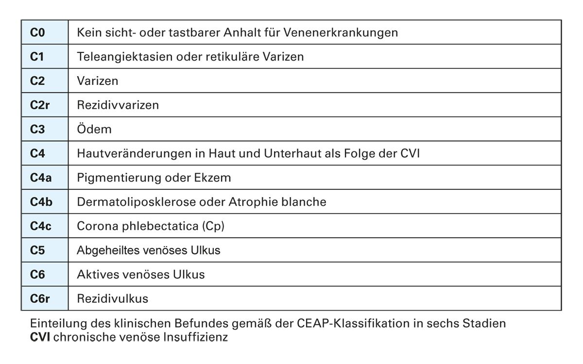 Die Form venöser Erkrankungen wird international nach der CEAP-Klassifikation eingeteilt (Clinical-Etiology-Anatomy-Pathophysiology). Klinisch reicht das Spektrum von C0 (keine sichtbaren Venenveränderungen) bis C6 (offenes Ulcus cruris venosum) [4] (Tab. 1).