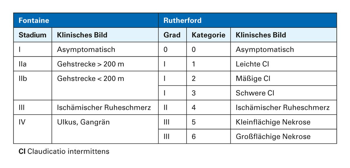 Klinisch wird die pAVK nach Fontaine in vier Stadien eingeteilt (Tab. 2): Stadium I: asymptomatisch (Zufallsbefund einer Durchblutungsstörung, z. B. pathologischer ABI); Stadium II: belastungsinduzierte Muskelschmerzen = Claudicatio intermittens (IIa: schmerzfreie Gehstrecke > 200 m; IIb: < 200 m) ; Stadium III: ischämischer Ruheschmerz; Stadium IV: trophische Gewebsverluste (Ulcera, Gangrän). Ergänzend existiert die Rutherford-Klassifikation (Grad 0-6), die ähnlich abgestuft ist und international in Studien genutzt wird (Tab. 2). Für die Praxis sind insbesondere Stadium II (Claudicatio) und höher relevant, da ab diesem Punkt Gefäßinterventionen erwogen werden. Etwa 20 % der Patienten weisen gleichzeitige Stenosen im Becken-, Oberschenkelund Unterschenkelbereich auf und bei < 10 % sind Armarterien betroffen. Die genaue Lokalisation der Stenosen (Beckentyp, Oberschenkeltyp, etc.) kann die Symptomatik beeinflussen (z. B. Gesäßschmerzen bei Aortoiliakalstenose, Wadenclaudicatio bei Femoralisstenose). Für Diagnose und Therapieplanung wird neben dem klinischen Stadium auch die hämodynamische Signifikanz (z. B. ABI-Wert) berücksichtigt [6, 7].