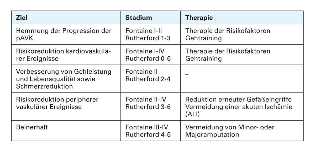 Die Herausforderung ist es oft, ein Therapiekonzept zu entwickeln, das beiden Komponenten gerecht wird. Ziel ist die Verbesserung des peripheren Blutflusses bei symptomatischen Patienten sowie die Therapie vaskulärer Risikofaktoren und Begleiterkrankungen [7, 12] (Tab. 3). Erste Säule der pAVK-Therapie ist das Management von Risikofaktoren. Dazu zählen Rauchstopp, Blutdruckkontrolle, ggf. Optimierung der Diabetestherapie und medikamentöse Senkung des LDL-Cholesterins. Die 2024 aktualisierte Leitlinie verfolgt einen ganzheitlichen Ansatz mit Bewegungstherapie und Gefäßtraining [7]: