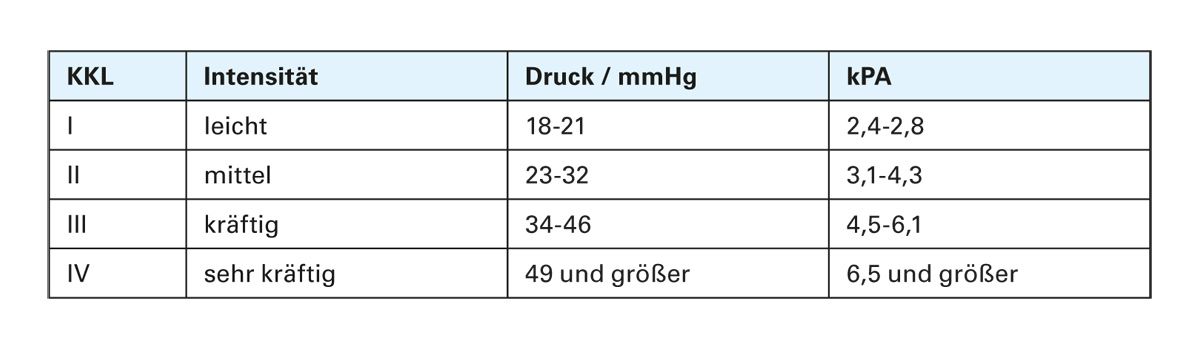 Tab. 4: Andrücke im Fesselbereich bei Verordnung der Strumpfart und Kompressionsklasse [modifiziert