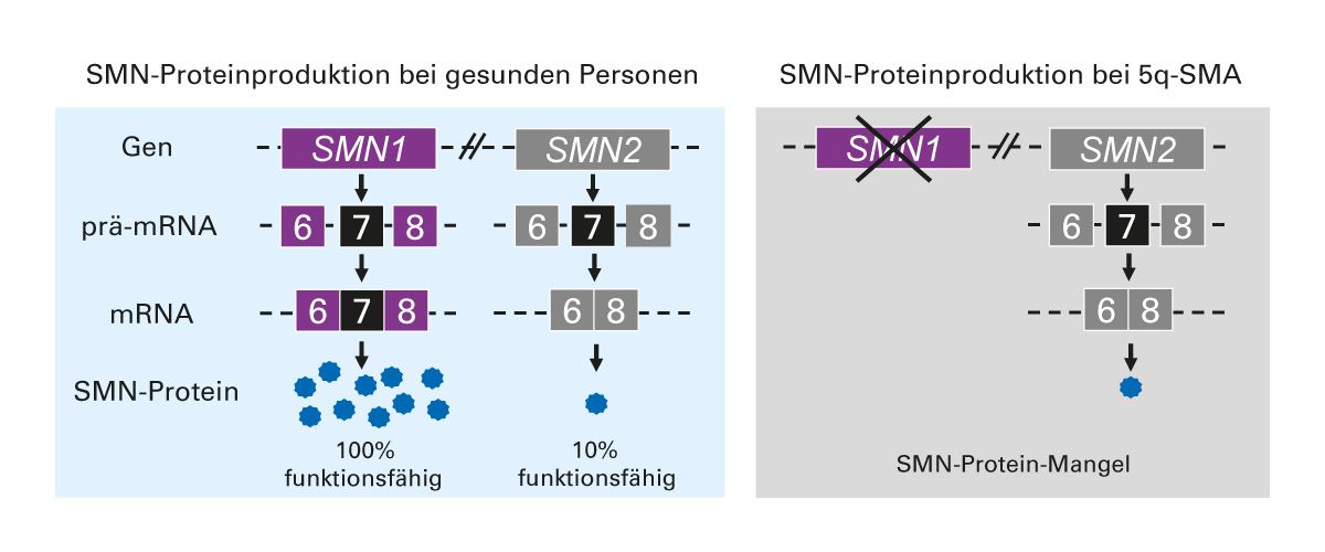 Als genetische Ursache der 5q-SMA wurde eine Defektmutation oder Deletion des SMN1-Gens identifiziert. Das SMN1– und das SMN2-Gen sind zwei benachbarte Gene auf dem q-Arm von Chromosom 5, die für das SMN-Protein kodieren. Bei gesunden Personen wird das SMN-Protein primär durch das SMN1-Gen exprimiert, das für etwa 90 % der Gesamtmenge an SMN-Protein verantwortlich ist. Dabei entsteht zunächst eine SMN1-prä-mRNA, die korrekt gespleißt wird und das Exon 7 enthält – eine essenzielle Voraussetzung für die Produktion eines voll funktionsfähigen SMN-Proteins. Folglich ist 100 % des über das SMN1-Gen exprimierten SMN-Proteins funktionsfähig (Abb. 1) [5].