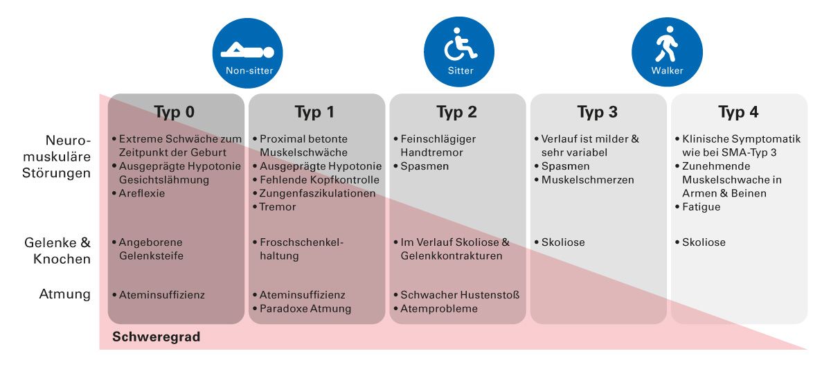 Die Einteilung der 5q-SMA in fünf Typen (Typ 0-4) basierte zunächst auf dem Erkrankungsbeginn, der Lebenserwartung und den voraussichtlich zu erreichenden motorischen Meilensteinen. Typ 0 stellt die schwerste Verlaufsform dar, mit ersten Symptomen bereits intrauterin und einer Lebenserwartung von meist weniger als sechs Monaten. Von Typ 0 bis zu Typ 4 steigen sowohl das Alter bei Symptombeginn als auch die Lebenserwartung, sodass Typ 4 häufig erst im dritten Lebensjahrzehnt auftritt [11].