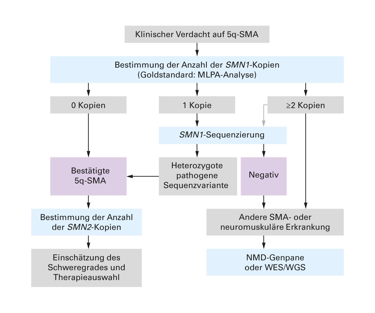 Bei klinischem Verdacht auf eine 5q-SMA muss umgehend eine molekulargenetische Diagnostik veranlasst werden. Die Bestimmung der SMN1– und SMN2-Kopienzahl (Exons 7 und 8) sollte mittels quantitativer Verfahren erfolgen, wobei die Multiplex Ligation-dependent Probe Amplification (MLPA) aktuell als Goldstandard gilt. Die Anzahl der SMN1-Kopien ist für die Diagnose entscheidend: Eine homozygote Deletion der Exons 7 und/oder 8 bestätigt eine 5q-SMA. Das Fehlen einer homozygoten Deletion schließt eine 5q-SMA jedoch nicht aus. In diesem Fall sollte eine Sequenzierung des SMN1-Gens (Sanger-Sequenzierung oder Long-Read-NGS) durchgeführt werden, um heterozygote pathogene Varianten zu identifizieren. Falls keine solche Mutation vorliegt, sollte eine andere Form der SMA oder neuromuskulären Erkrankung (NMD) mittels NMD-Genpanel oder Vollständiger Exom- oder Gensequenzierung (WES/WGS) abgeklärt werden (Abb. 3) [11].
