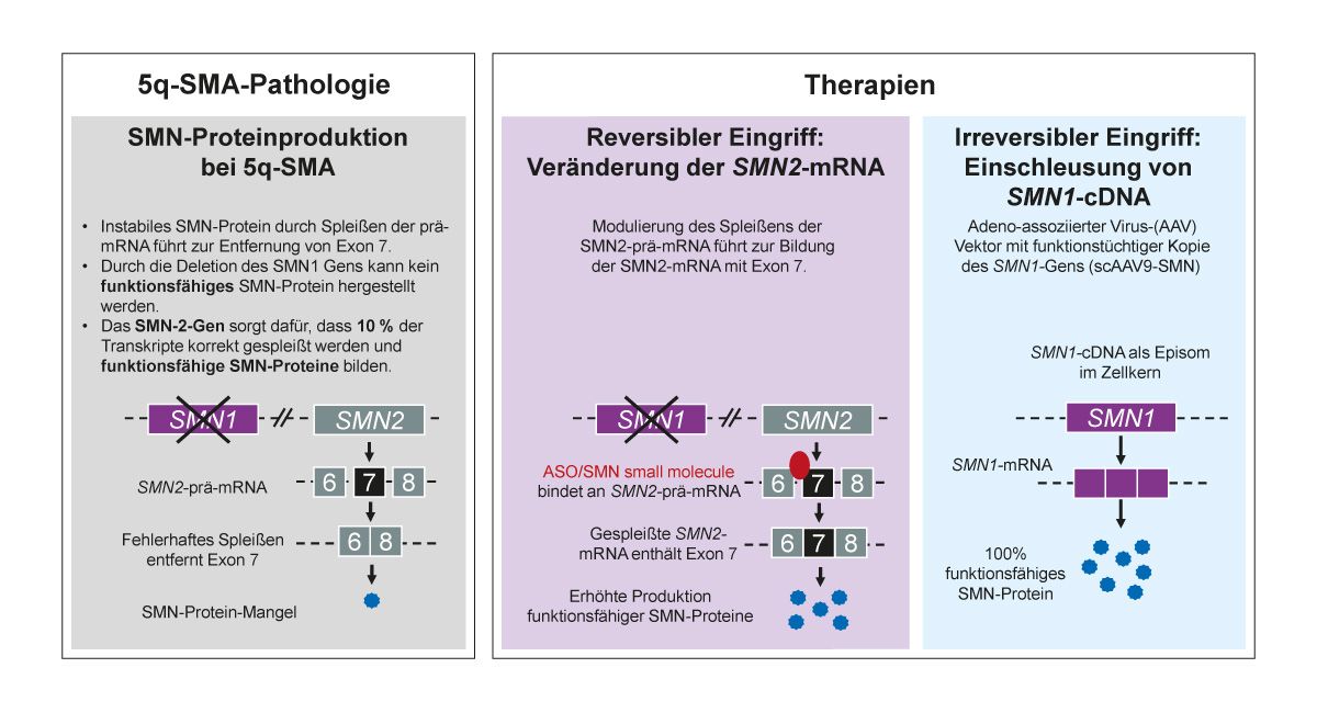 In Deutschland sind derzeit drei medikamentöse Therapien zur Behandlung der 5q-SMA zugelassen: Nusinersen, Risdiplam und Onasemnogene Abeparvovec. Diese kausal orientierten Therapien ermöglichen die kontinuierliche Produktion des SMN-Proteins in den Motoneuronen des Rückenmarks, die unbehandelt degenerieren würden [18]. Dabei wird zwischen reversiblen Therapien, die die Genexpression auf mRNA-Ebene beeinflussen, und der Genersatztherapie unterschieden, die dauerhaft in die Genexpression eingreift [11].