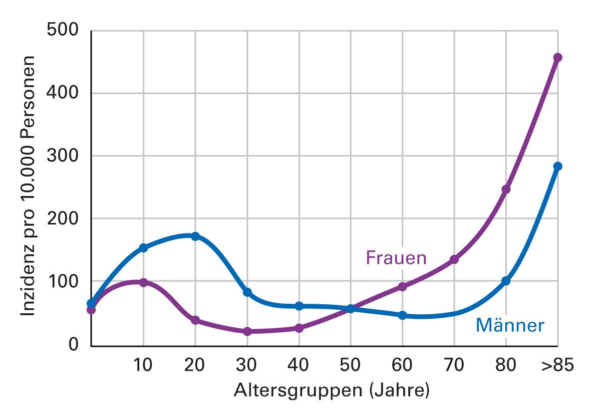 Die Osteoporose führte 2019 in Deutschland zu 688.000 registrierten Frakturen, davon ca. 67.000 Wirbelkörper- und 230.000 Oberschenkelfrakturen. Die tatsächlichen Frakturzahlen (vor allem die Wirbelfrakturen) dürften aber wesentlich höher liegen. So sind auf die Frakturen jährlich mehr Krankenhaustage zurückzuführen als beispielsweise auf Diabetes mellitus, Herzinfarkt und Brustkrebs zusammen. Bei Männern gibt es einen Häufigkeitsgipfel mit ca. 20 Jahren und bei Frauen ein deutlich früheres Auftreten der Frakturen im Alter [17] (Abb. 1).