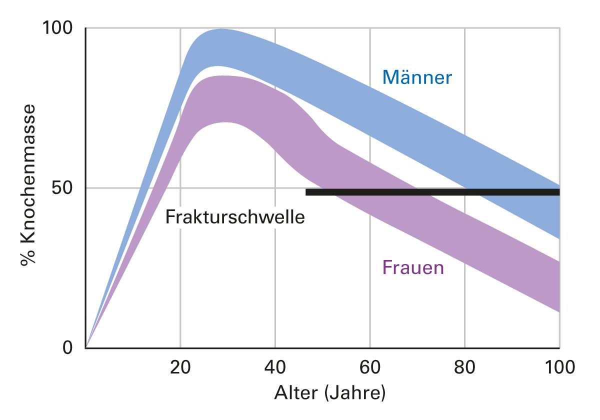Männern ist ein Rückgang des Testosteronspiegels im Alter ebenfalls mit einer erhöhten Knochenresorption und einer verminderten Knochenmasse verbunden [19], der aber nicht so steil verläuft wie bei der Frau. Daher haben Frauen in etwa doppelt so häufig Osteoporose wie Männer.