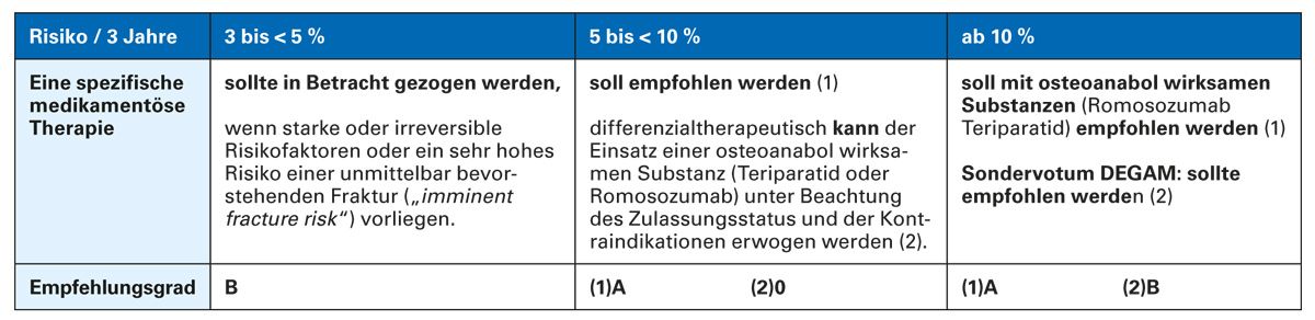 - Bei einem 3-Jahres-Risiko für schwere osteoporotische Frakturen von über 5 % soll eine spezifische Osteoporosemedikation verordnet werden.
