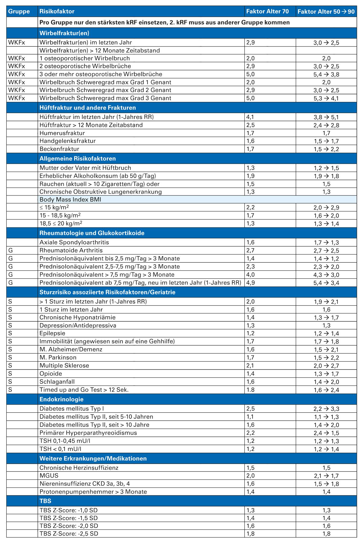 Der Risikorechner umfasst jetzt 33 priorisierte Risikofaktoren (inklusive Alter), die in die Kalkulation des Frakturrisikos eingehen. Neu dazugekommen sind Humerusfrakturen, Beckenfrakturen, chronische Hyponatriämie, Herzinsuffizienz, Niereninsuffizienz, Multiple Sklerose sowie ein Timed up and Go-Test > 12 Sekunden. Neu aufgenommene, aber nicht in der Risikokalkulation des Risikorechners berücksichtigte Risikofaktoren sind ein Systemischer Lupus erythematodes, Immobilität, Frailty, HIV sowie bariatrische Operation. Neu ist auch die Beachtung von Risikofaktoren, die das imminente Frakturrisiko erhöhen: Wirbelkörperfraktur, Schenkelhalsfraktur, zwei Stürze und mehr innerhalb der zurückliegenden 12 Monate, > 5 mg Prednisolon > 3 Monate innerhalb der letzten 12 Monate [1].