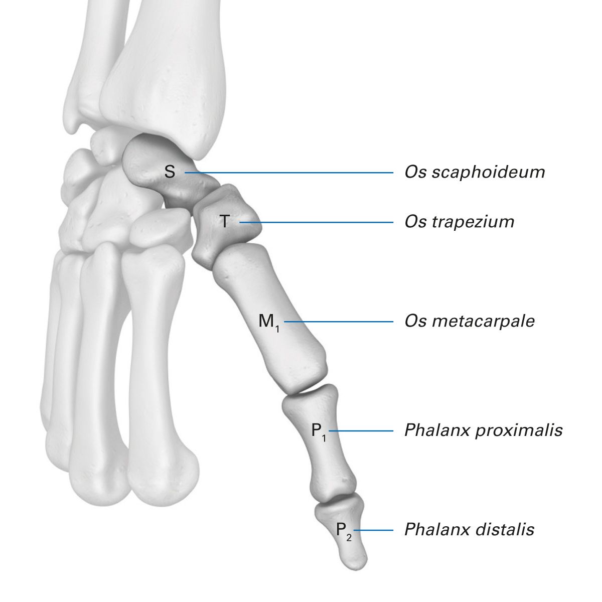 Die funktionell wesentliche Bedeutung des Daumens (Pollex) beruht auf seiner relativen Stellung zu den übrigen Fingern. Er ist essenziell für die Greiffunktion der Hand. Der Daumen besteht aus lediglich zwei Phalanxknochen, der Phalanx distalis und proximalis. Zusammen mit dem ersten Mittelhandknochen (Os metacarpale I), dem großem Vieleckbein (Os trapezium) und dem Kahnbein (Os scaphoideum) besteht der radiale Handstrahl somit aus insgesamt fünf Knochen (Abb. 5).