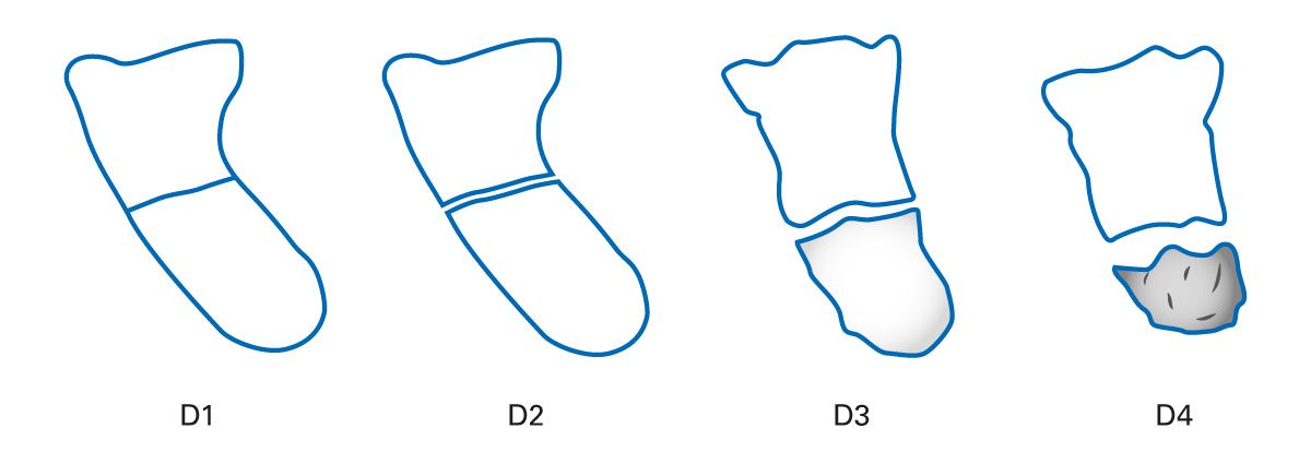 Grob unterscheiden lassen sich straffe Pseudarthrosen des Kahnbeins mit fibröser Überbrückung und ohne Anzeichen einer Arthrose oder eines karpalen Kollaps sowie mobile Pseudarthrosen mit zunächst diskreter, später deutlicher Kahnbeindeformierung, manifester Arthrose sowie letztlich nekrotischem Zerfall des proximalen Fragments und fixiertem karpalen Kollaps [5]. Pseudarthrosen werden nach der Klassifikation von Herbert und Filan [26] in vier Pseudarthrosetypen unterteilt (Abb. 6).