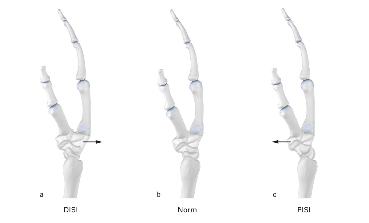 Abb. 7: Schematische Darstellung der dissoziativen Instabilitäten der Handwurzel. Seitliche Ansicht: (a) DISI (Dorsal flexed intercalated Segment Instability)-Fehlstellung, (b) Normalstellung (c) PISI (Palmar flexed intercalated Segment Instability)-Stellung der distalen zur proximalen Karpalreihe (modifiziert nach [11])
