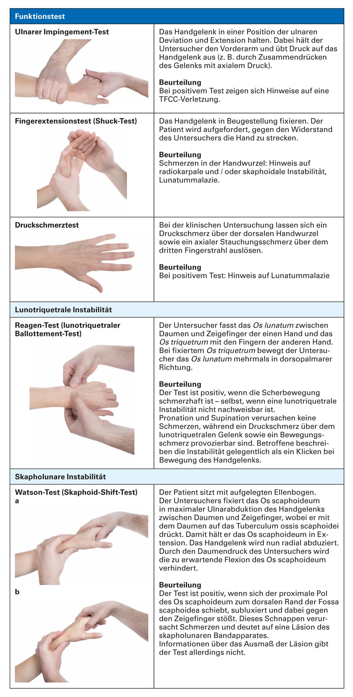 Verletzungsmuster. Die damit einhergehenden Schmerzen und Funktionseinschränkungen bedürfen einer genauen klinischen Untersuchung mittels spezifischer Tests bei Kenntnis der Handanatomie, ergänzt um die adäquate Röntgenbildgebung sowie gegebenenfalls Schnittbildverfahren und Arthroskopie, u. a. zur Klassifikation der Verletzungen. Die stufenweise Diagnostik ermöglicht eine stadiengerechte Behandlung.