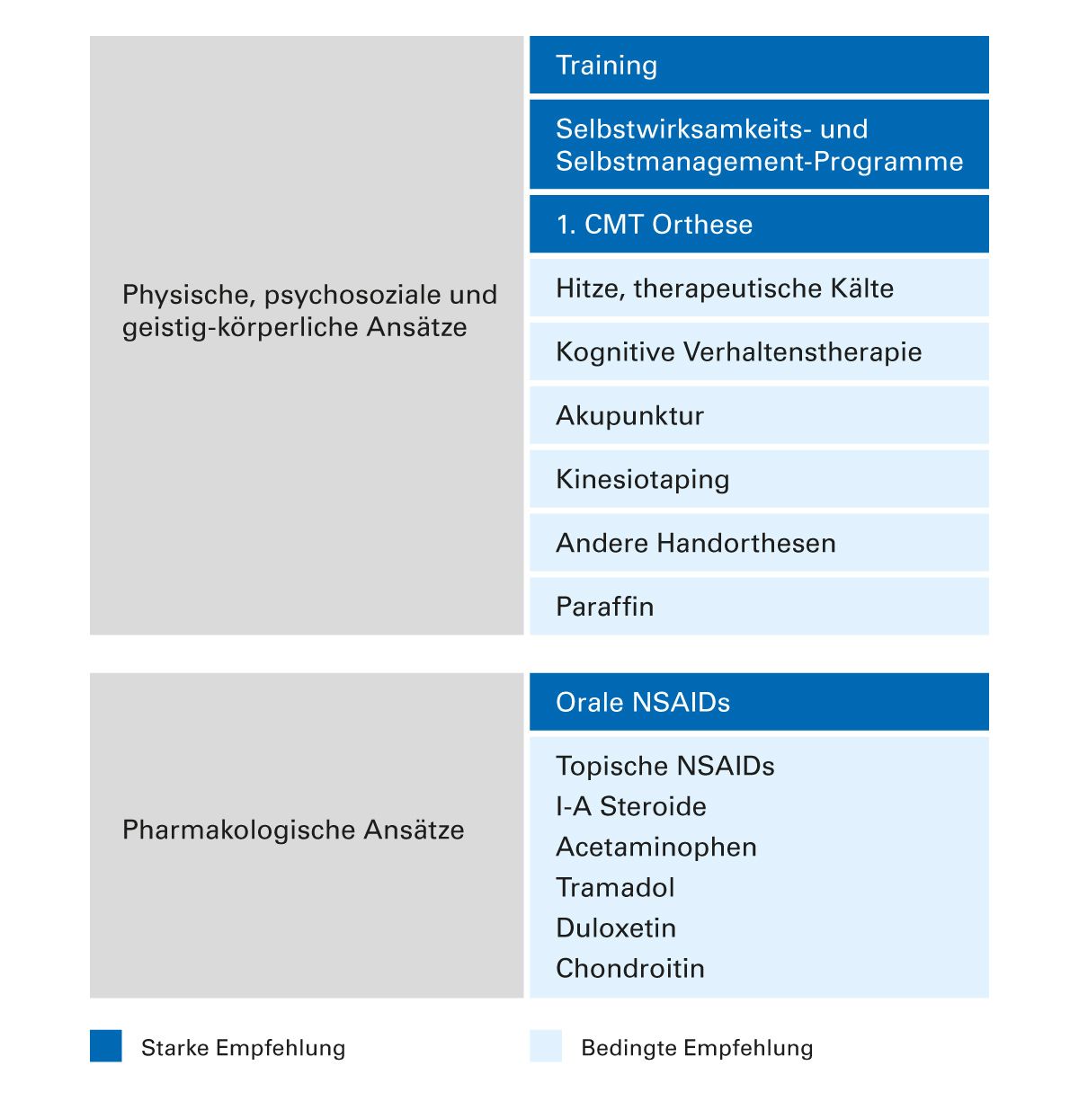Abb. 1: Therapien für die Behandlung von Osteoarthritis. Stark und bedingt empfohlene Verfahren für die Behandlung der Hand (modifiziert nach [2])