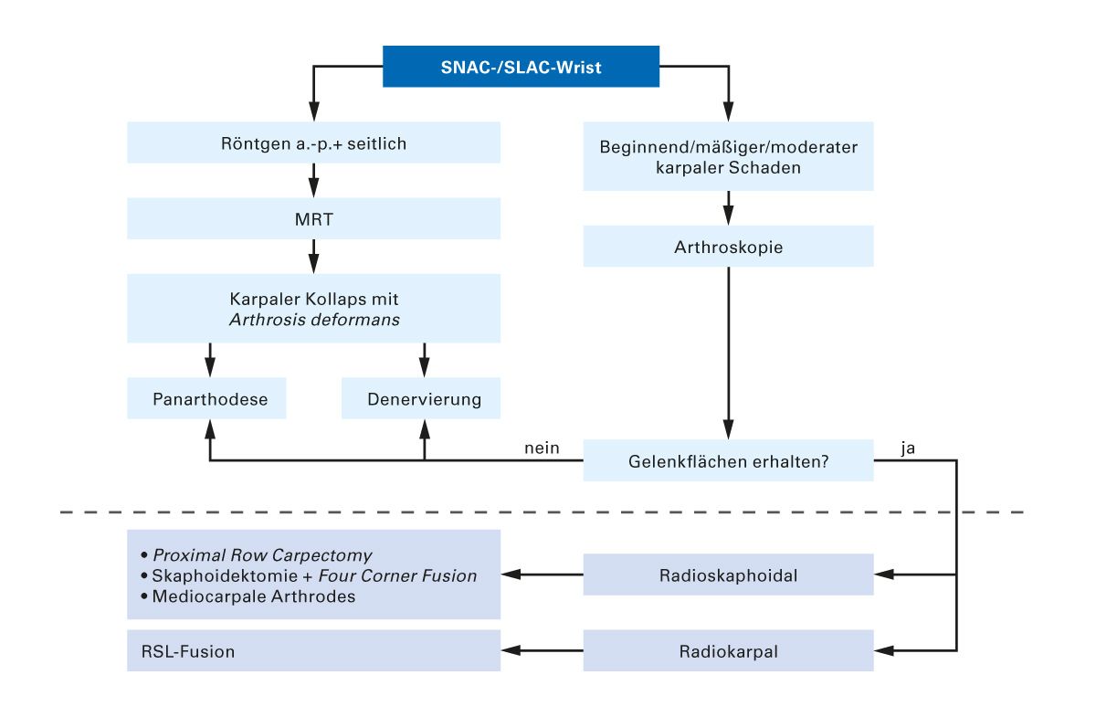 Als schwerste Form einer arthrotisch beschädigten Handwurzel ist der karpale Kollaps anzusehen, entweder nach unversorgter Kahnbeinfraktur (SNAC-Wrist: scaphoid nonunion advanced collapse) oder bei geschädigtem Bandapparat zwischen Kahn- und Mondbein (SLAC-Wrist: scapho-lunate advanced collapse). Ein Therapiealgorithmus ist in Abb. 1 dargestellt.