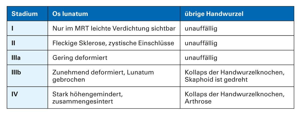 Die aseptische Knochennekrose des Os lunatum (Lunatummalazie, Kienböck-Krankheit) wird im Frühstadium konservativ und ansonsten mit längenausgleichenden, teilfusionierenden oder versteifenden Operationen behandelt. Der Krankheitsverlauf ist im Einzelfall schwer vorherzusagen und häufig progredient. Das hängt u.a. mit dem bis heute mangelnden Verständnis der Krankheitsursachen zusammen sowie mit der unzureichenden Berücksichtigung der Gelenkflächen- und Durchblutungssituation in der rein skelettorientierten Klassifikation nach Lichtman (Tab. 1), an der sich im Allgemeinen die Therapieentscheidungen orientieren – für andere Klassifikationen gilt Ähnliches [28, 29].