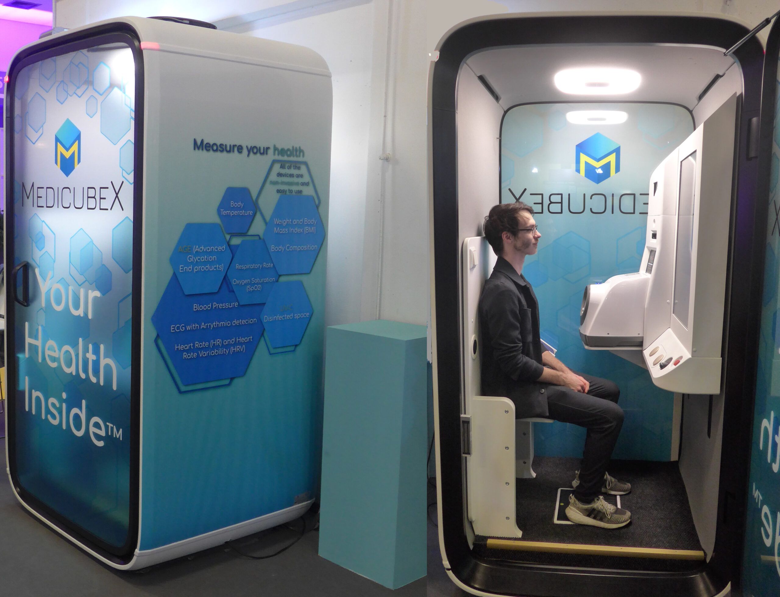 Wie das in Zukunft automatisiert ablaufen könnte, war auf der DMEA beim finnischen Anbieter Medicube X zu sehen. Deren eHealth Station sieht aus wie ein Dixi-Klo und enthält eine Reihe von nicht-invasiven CE-gekennzeichneten medizinischen Diagnose-Geräten, die in eine modulare Plattform integriert sind.