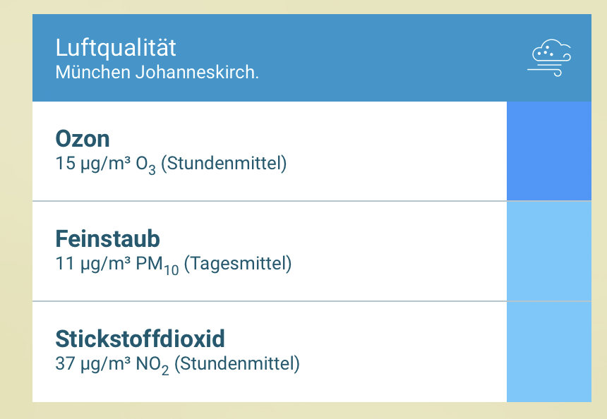 Die Website vom Umweltbundesamt liefert viele Daten, ist aber für einen ganz kurzen Blick nur bedingt geeignet. Zwei positive Beispiel haben wir aber doch noch: die App umweltinfo.de von der Bayerischen Staatsregierung (Beispiel im Foto unten) und die App Breathe – Luftqualitätsmonitor. Letztere kooperiert mit der o.g. luftdaten.info.